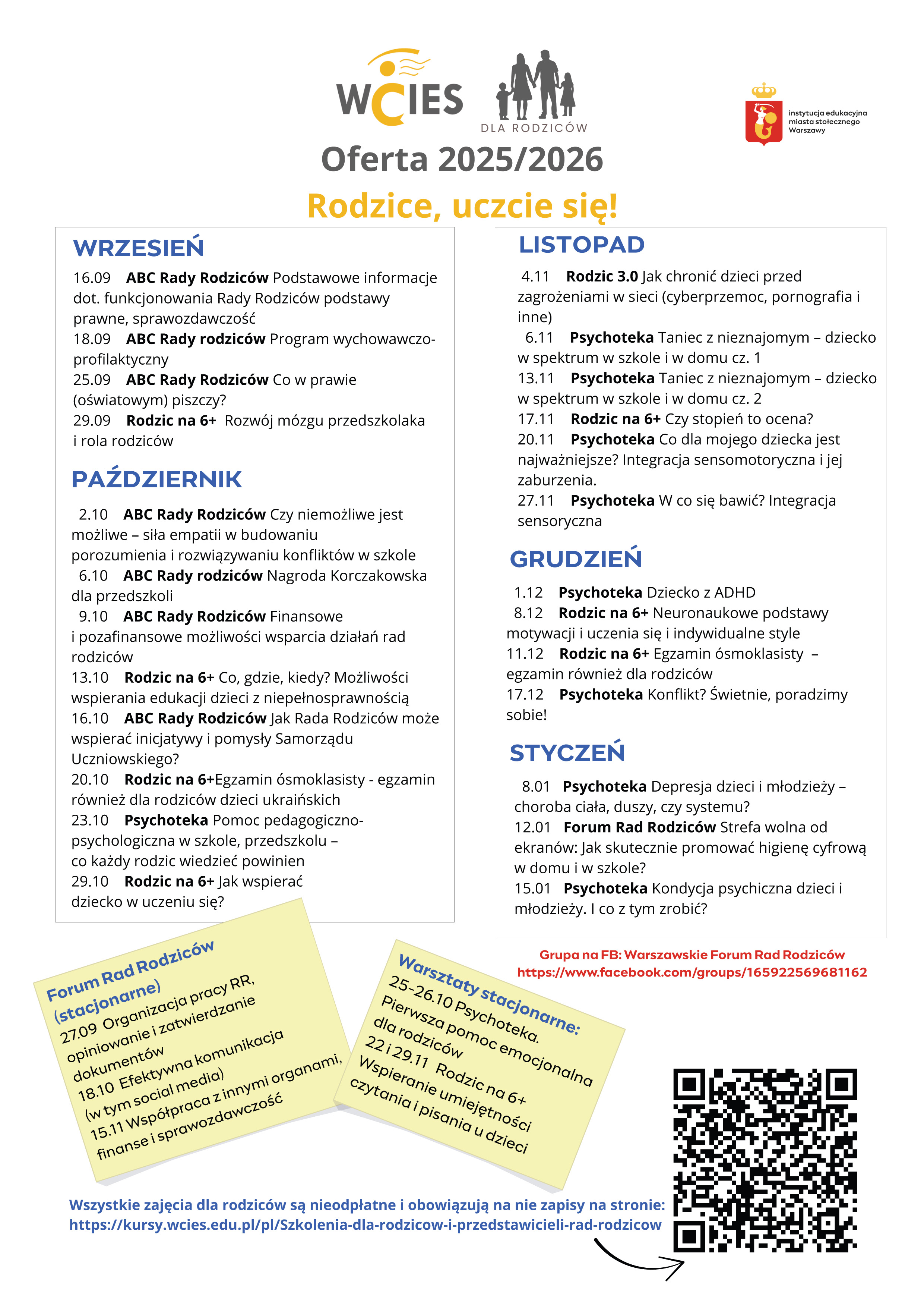 Warszawskie Centrum Innowacji Edukacyjno-Społecznych i Szkoleń (WCIES) zaprasza rodziców na nieodpłatne i odbywające się w większości w formie on-line kursy i szkolenia dla rodziców.